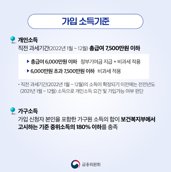 7월 가입 신청자의 경우 2021년도 기준으로 개인 및 가구 소득을 판단하여 가입 가능 여부를 결정합니다.